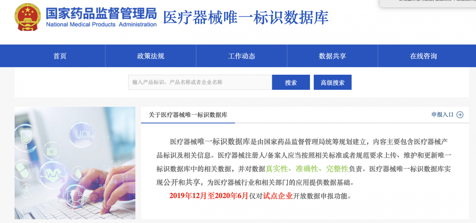 2019年12月10日,医疗器械唯一标识数据库正式上线,并对试点企业开启申报功能。